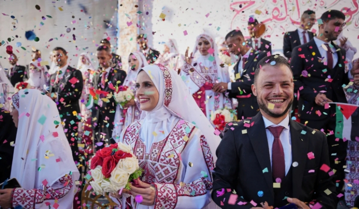 গতকাল মঙ্গলবার গাজার দক্ষিণাঞ্চলের খান ইউনিসে ৫৪ যুগল গণবিয়ের এই আয়োজনে স্বামী-স্ত্রীর বন্ধনে আবদ্ধ হয়। যুদ্ধ-বিধ্বস্ত দেশটিতে জীবনকে উদযাপনের জন্য সাহসী পদক্ষেপটি নেওয়া হয়।