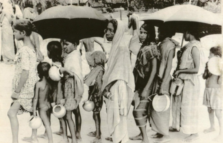 ভারতে উদ্বাস্তু শিবিরের মানুষজন খাবারের জন্য লাইন দিয়ে দাঁড়িয়ে আছেন (১৯৭১)। ছবি: সংগৃহীত।