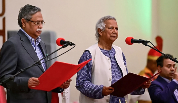 অন্তর্বর্তী সরকারের প্রধান উপদেষ্টাকে রাষ্ট্রপতি শপথ বাক্য পাঠ করাচ্ছেন। ফাইল ছবি: বাসস।