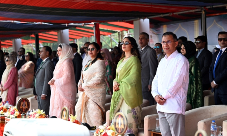 এর আগে সকাল ৯টা ৫৫ মিনিটে প্রধানমন্ত্রী তারেক রহমান প্যারেড গ্রাউন্ডে পৌঁছালে তাকে স্বাগত জানান মুক্তিযুদ্ধ বিষয়ক মন্ত্রী, প্রতিমন্ত্রী এবং তিন বাহিনীর প্রধানগণ।