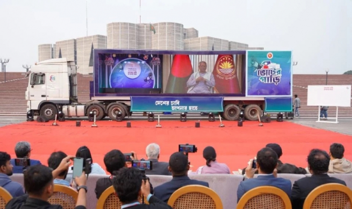 ঢাকায় জাতীয় সংসদ ভবনের দক্ষিণ প্লাজায় ফিতা কেটে ‘ভোটের গাড়ি’র আনুষ্ঠানিক উদ্বোধন করেন তথ্য ও সম্প্রচার উপদেষ্টা সৈয়দা রিজওয়ানা হাসান, সংস্কৃতি বিষয়ক উপদেষ্টা মোস্তফা মোস্তফা সরয়ার ফারুকী, নির্বাচন কমিশন সচিবালয়ের সিনিয়র সচিব আখতার আহমেদ এবং প্রধান উপদেষ্টার প্রেস সচিব শফিকুল আলম।
