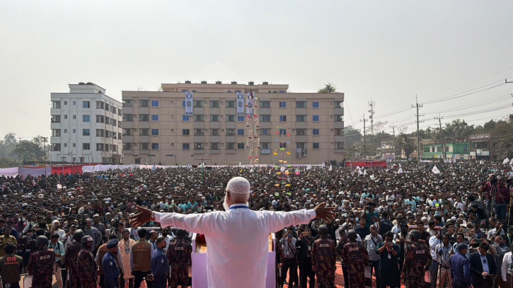 জামায়াতে ইসলামীর আমির ডা. শফিকুর রহমান শনিবার মৌলভীবাজারে আয়োজিত ১১ দলীয় নির্বাচনী ঐক্যের জনসভায় প্রধান অতিথির বক্তব্য দেন। ছবি : বাসস
