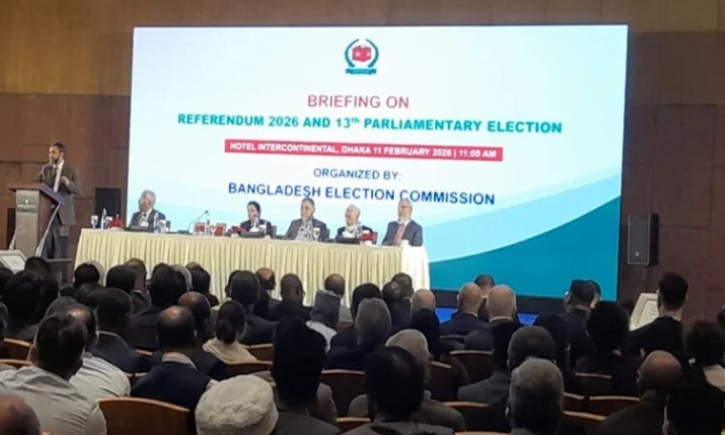 বুধবার রাজধানীর একটি হোটেলে আন্তর্জাতিক পর্যবেক্ষক ও গণমাধ্যম প্রতিনিধিদের উদ্দেশে নির্বাচন কমিশনের ব্রিফিং অনুষ্ঠিত হয়। ছবি : বাসস