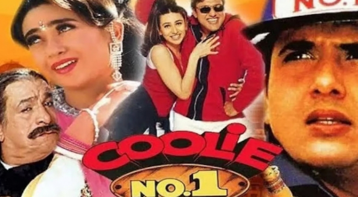 কুলি নম্বর ওয়ান সিনেমার পোষ্টার যেখানে নায়ক গোবিন্দকে ধরে আছেন নায়িকা কারিশমা কাপুর। ছবি: সংগৃহীত।