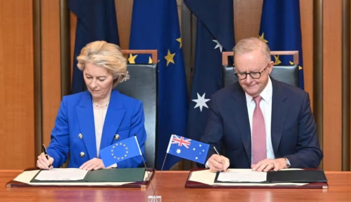 অস্ট্রেলিয়া ও ইউরোপীয় ইউনিয়ন (EU) মঙ্গলবার দীর্ঘ প্রতীক্ষিত একটি মুক্ত বাণিজ্য চুক্তি স্বাক্ষর করেছে। বিশ্বব্যাপী বাণিজ্য নিয়ে চলমান অনিশ্চয়তার মধ্যে এই চুক্তির পাশাপাশি দেশগুলো প্রতিরক্ষা সহযোগিতা এবং বিরল খনিজ সম্পদের প্রাপ্যতা বৃদ্ধির বিষয়েও একমত হয়েছে।